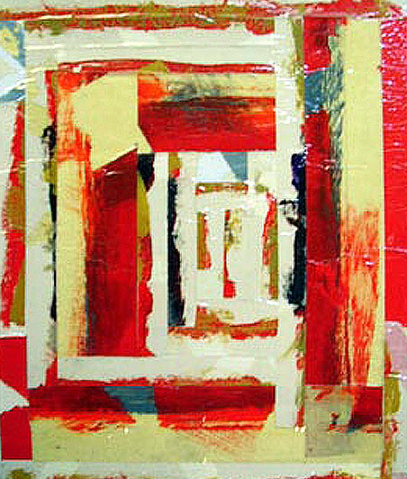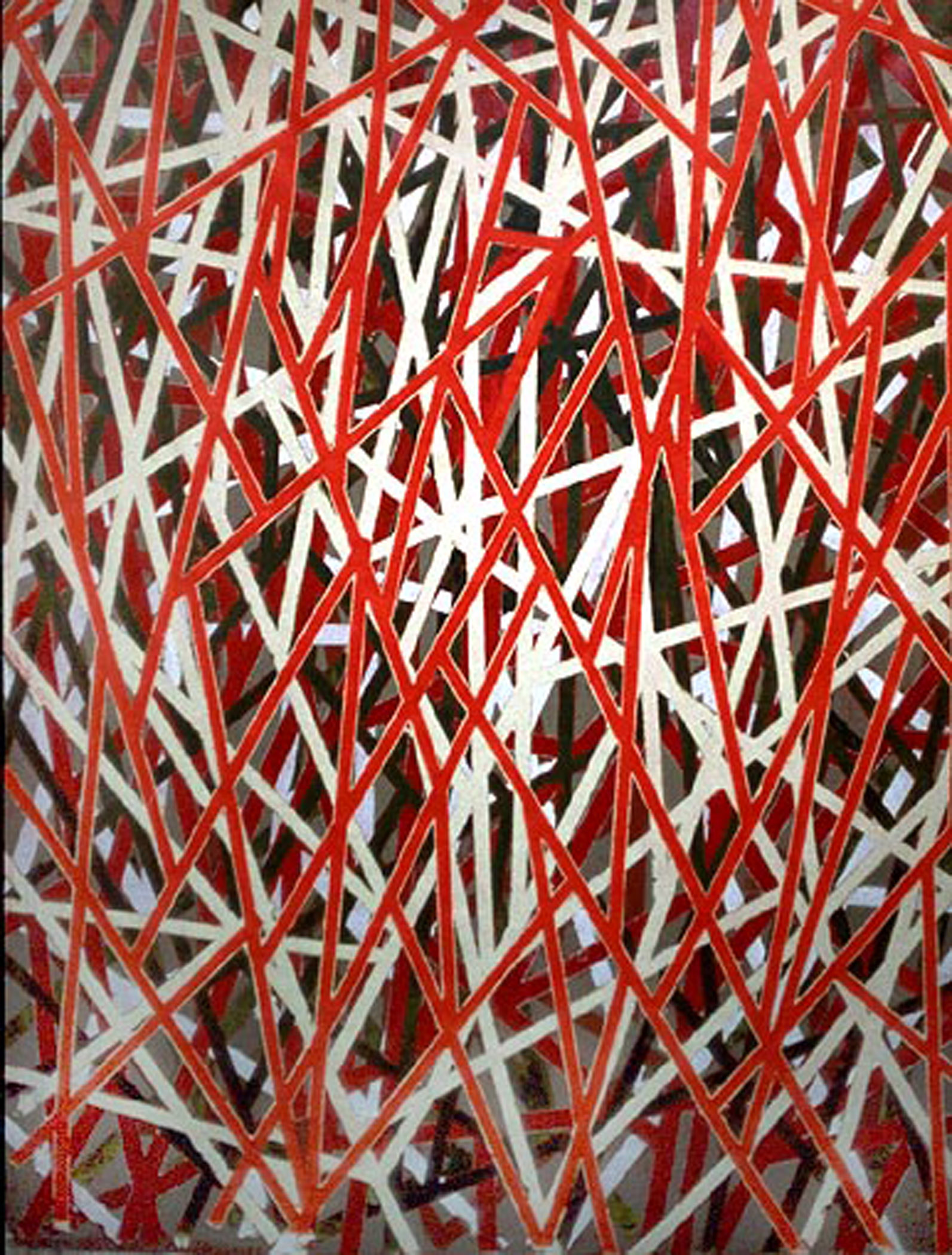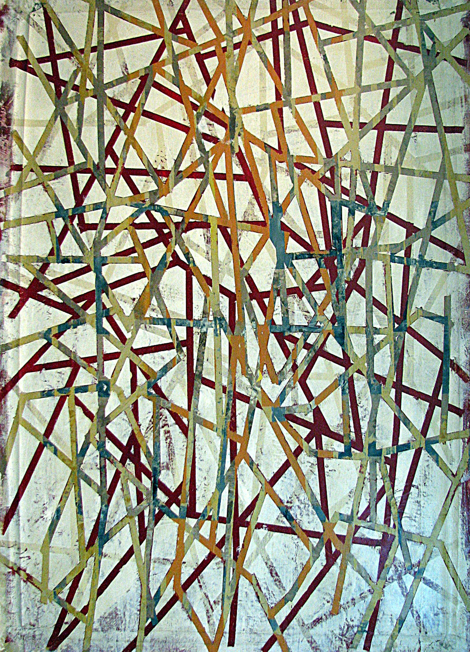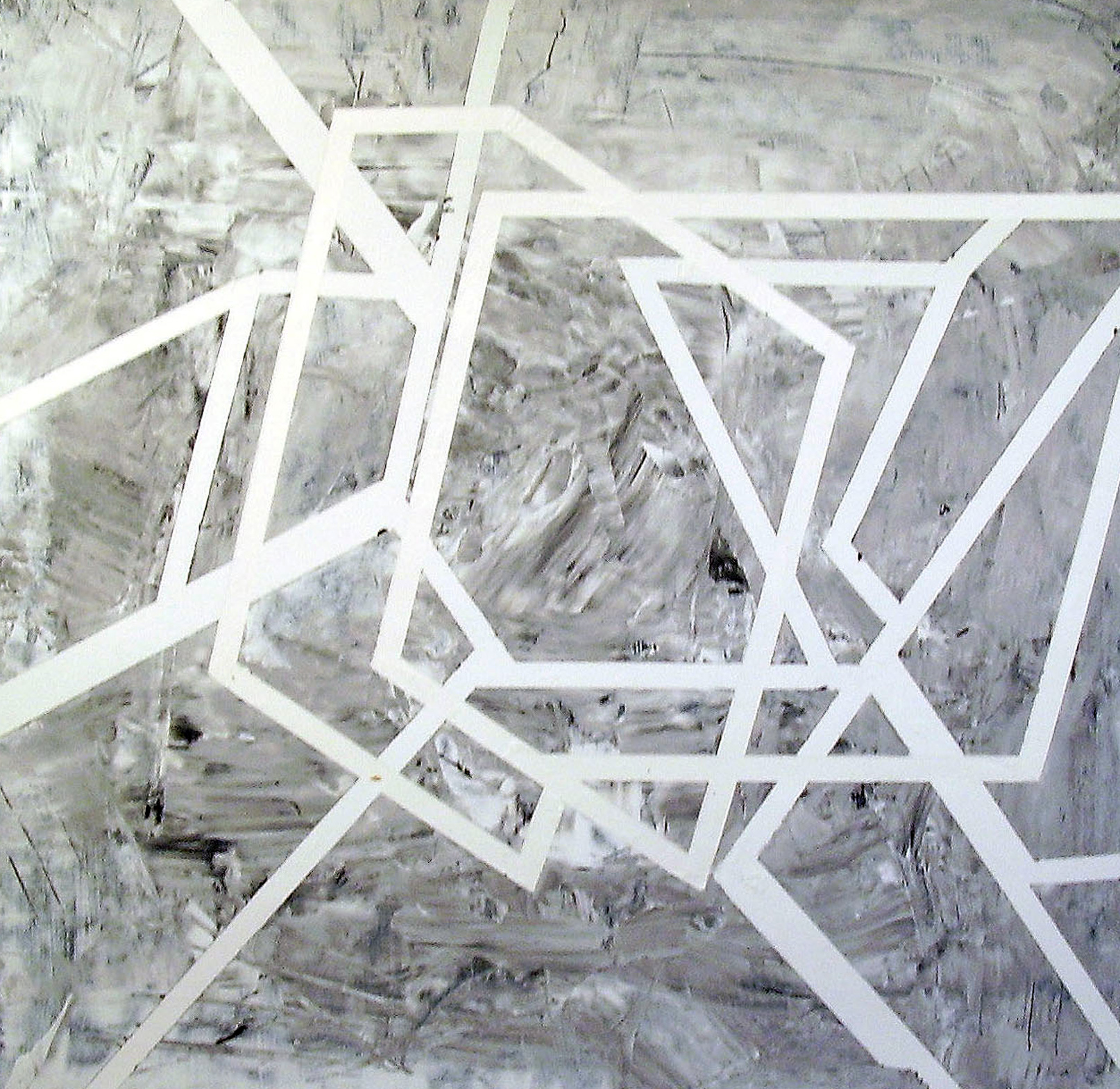 The paintings are constructed using masking tape and following a series of movements. The movements, however, are not exact, nor the pieces of tape uniform. In the building of the figure, the pieces of tape and the spaces in between them articulate and negotiate amongst themselves a number of spatial, textural and chromatic decisions while following a general blueprint. In the process the general direction of helicoidal movements is constantly deconstructed and questioned by the textures, colors, and values of the pieces of tape as well as by their placement in the general arrangement.