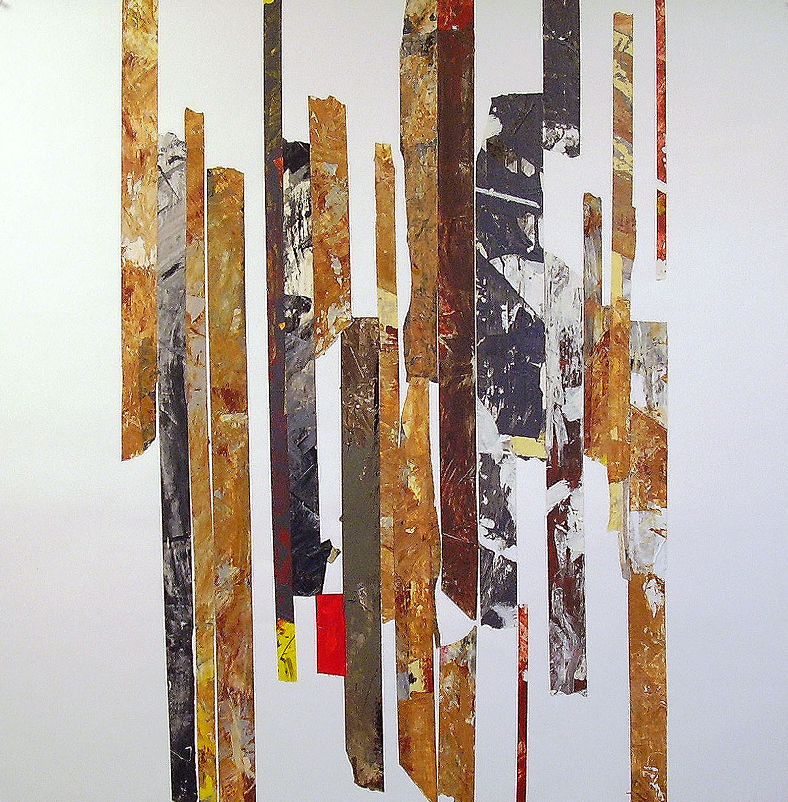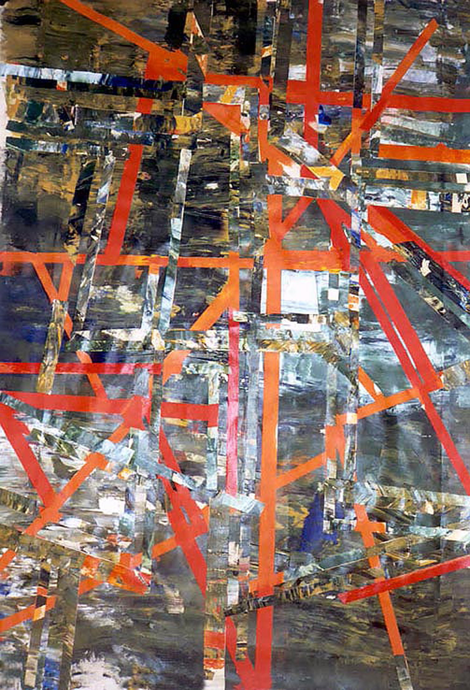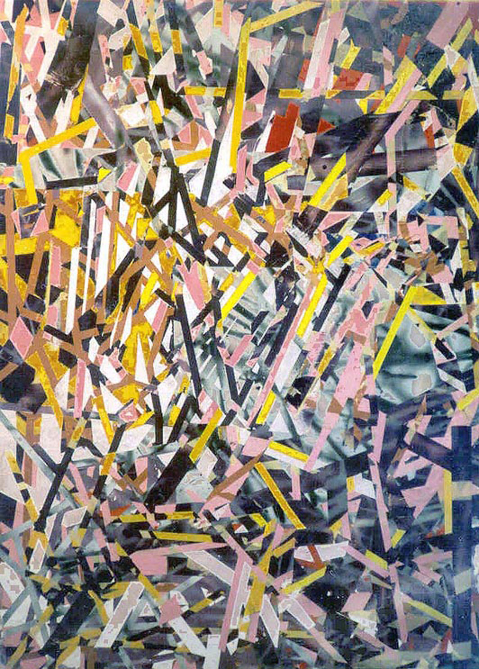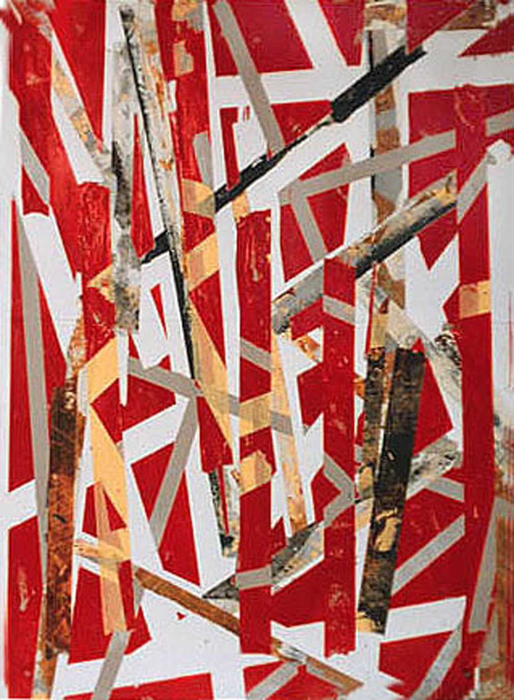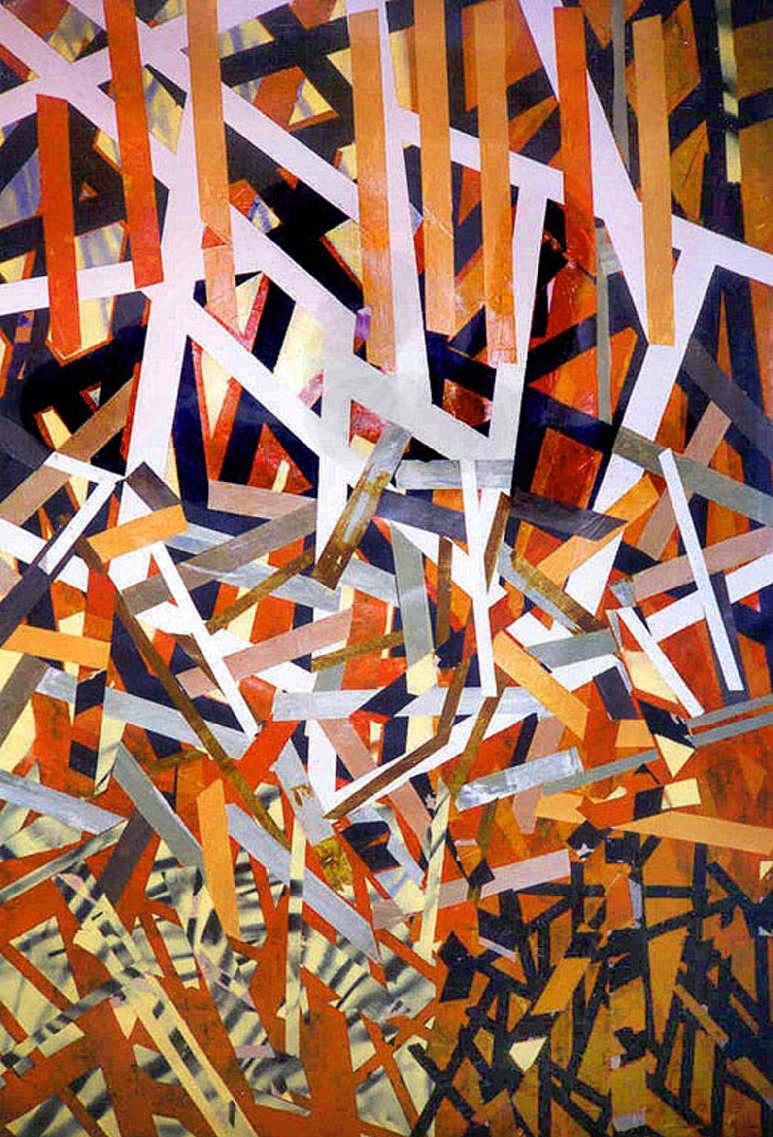 The paintings are constructed using masking tape and following a series of movements. The movements, however, are not exact, nor the pieces of tape uniform. In the building of the figure, the pieces of tape and the spaces in between them articulate and negotiate amongst themselves a number of spatial, textural and chromatic decisions while following a general blueprint. In the process the general direction of helicoidal movements is constantly deconstructed and questioned by the textures, colors, and values of the pieces of tape as well as by their placement in the general arrangement.